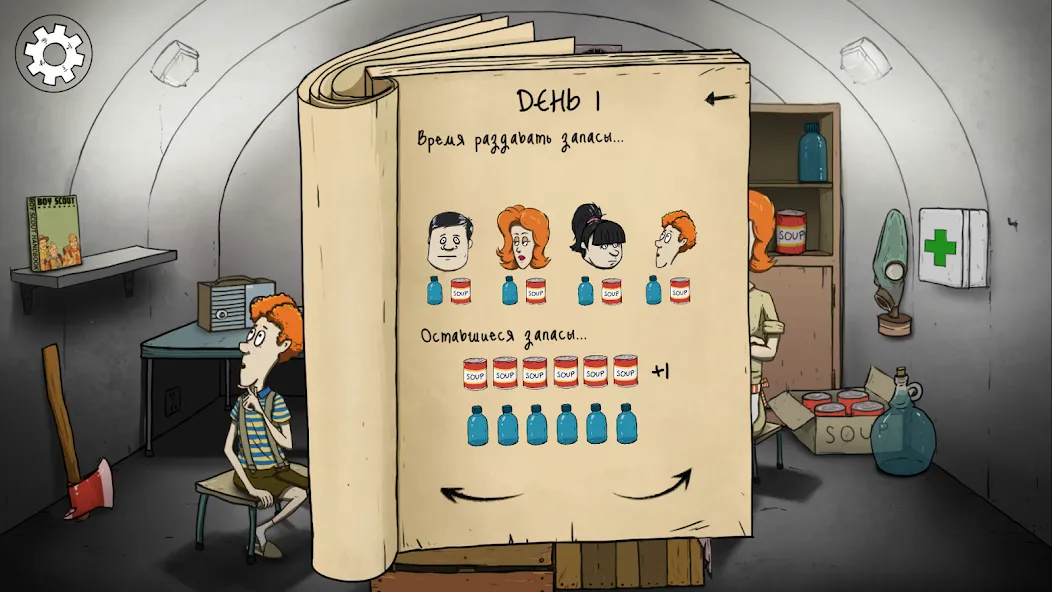 Игра делится на два этапа. Первый — хаотичный сбор припасов за минуту. Бегаешь по дому, хватаешь консервы, аптечки, радио, членов семьи. Второй — медленное выживание в бункере. Распределяешь ресурсы между четырьмя персонажами, читаешь дневник, принимаешь решения.