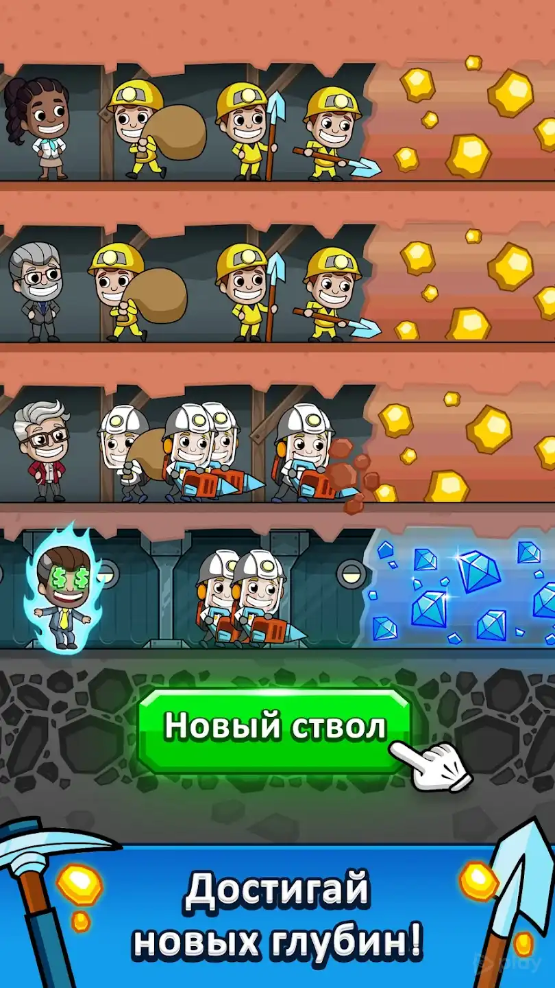 Начинаешь с одного шахтера и лопаты. Постепенно открываешь новые рудники, ставишь лифты для подъема добычи, нанимаешь надсмотрщиков. Чем глубже копаешь, тем ценнее ресурсы.