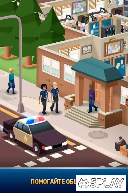 Геймплей затягивает именно механикой idle. Зашёл на пять минут, потратил накопленное, запустил новые улучшения — и можешь выходить. Прогресс не останавливается. Город продолжает платить налоги, копы продолжают работать.