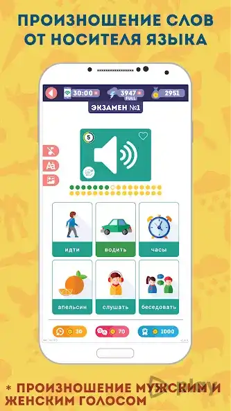 Есть аудио для всех слов — можно слушать и повторять. Задания разные: от простого запоминания до построения сложных конструкций. Сложность растет постепенно, можно начинать с нуля или подтягивать то, что уже знаешь.