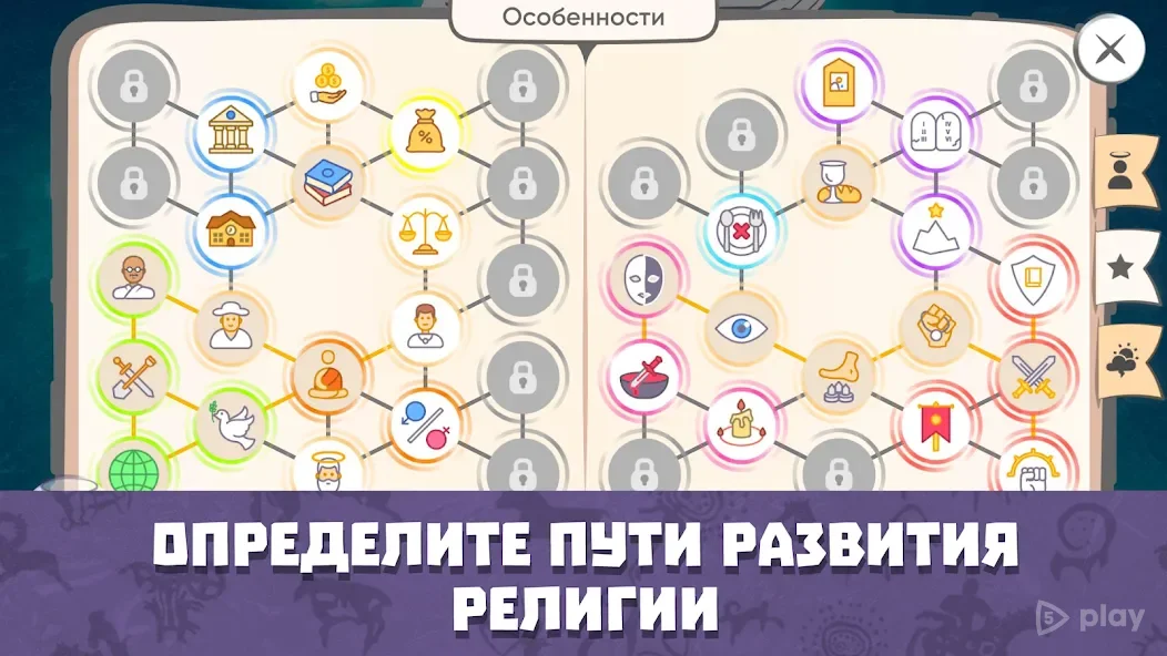 Карта мира реагирует на ваши действия. Где-то вера приживается быстро, где-то встречает сопротивление. Нужно думать стратегически — куда двигаться дальше, какие улучшения качать, как обходить препятствия.