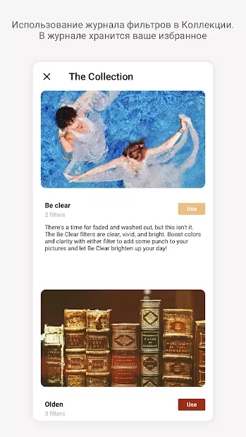 Фильтры применяются в реальном времени, можно сразу видеть результат. Коллажи собираются из серии снимков по готовым шаблонам — выбрал, нажал, готово. На фото накладываются штампы: дата, смайлики, печатки, логотипы. Качество снимков настраивается, есть режим зеркала для фронтальной камеры.
