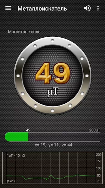 Третья секция — компас и металлоискатель. Компас рабочий, а вот искатель металла ловит только сталь и то вплотную. Четвёртая — звук: шумометр показывает децибелы, виброметр меряет вибрацию. Последняя панель — фонарик, зеркало через фронталку и лупа. Мелочь, но иногда выручает.