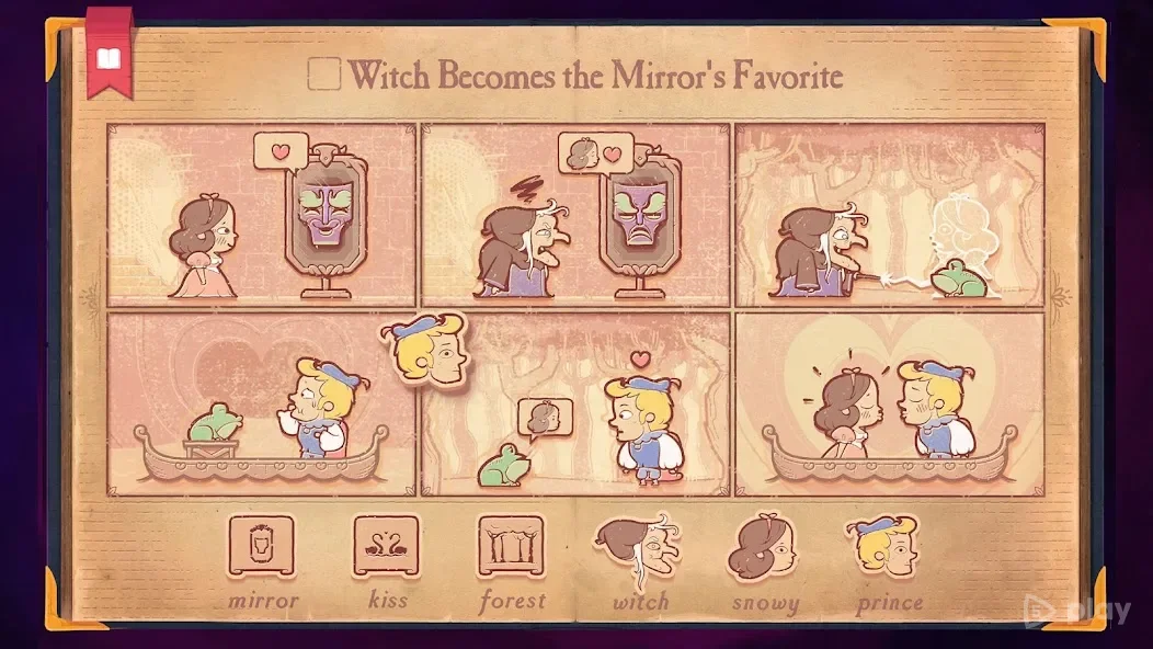 Каждый уровень — это задача. Нужно создать историю с определенным финалом: трагедию, комедию, любовную драму. Ты берешь персонажей вроде короля, дракона, рыцаря или ведьмы, размещаешь их в кадрах, добавляешь события. Один и тот же набор элементов можно скомбинировать по-разному.