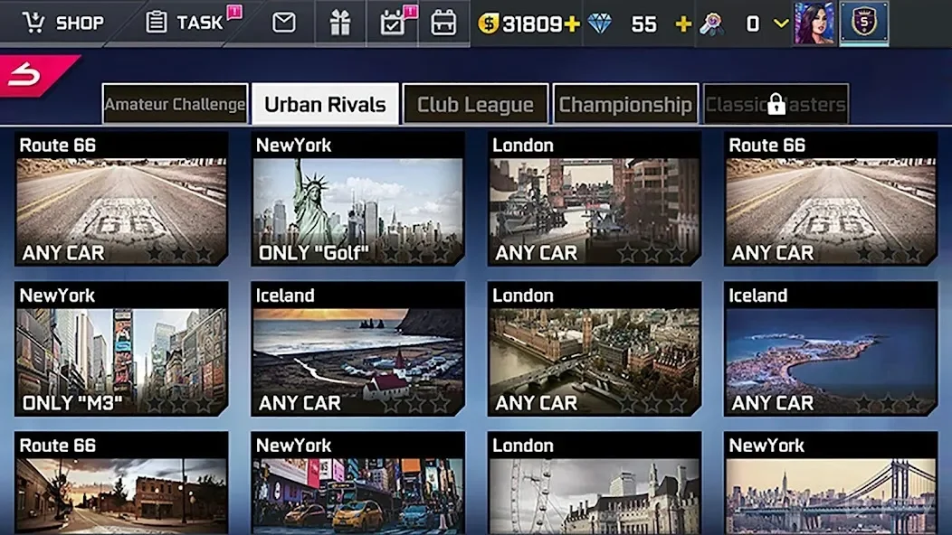 Несколько режимов гонок по городским улицам и трассам. Машины разные — от обычных седанов до спорткаров. Графика неплохая для мобильной игры, детализация на уровне.