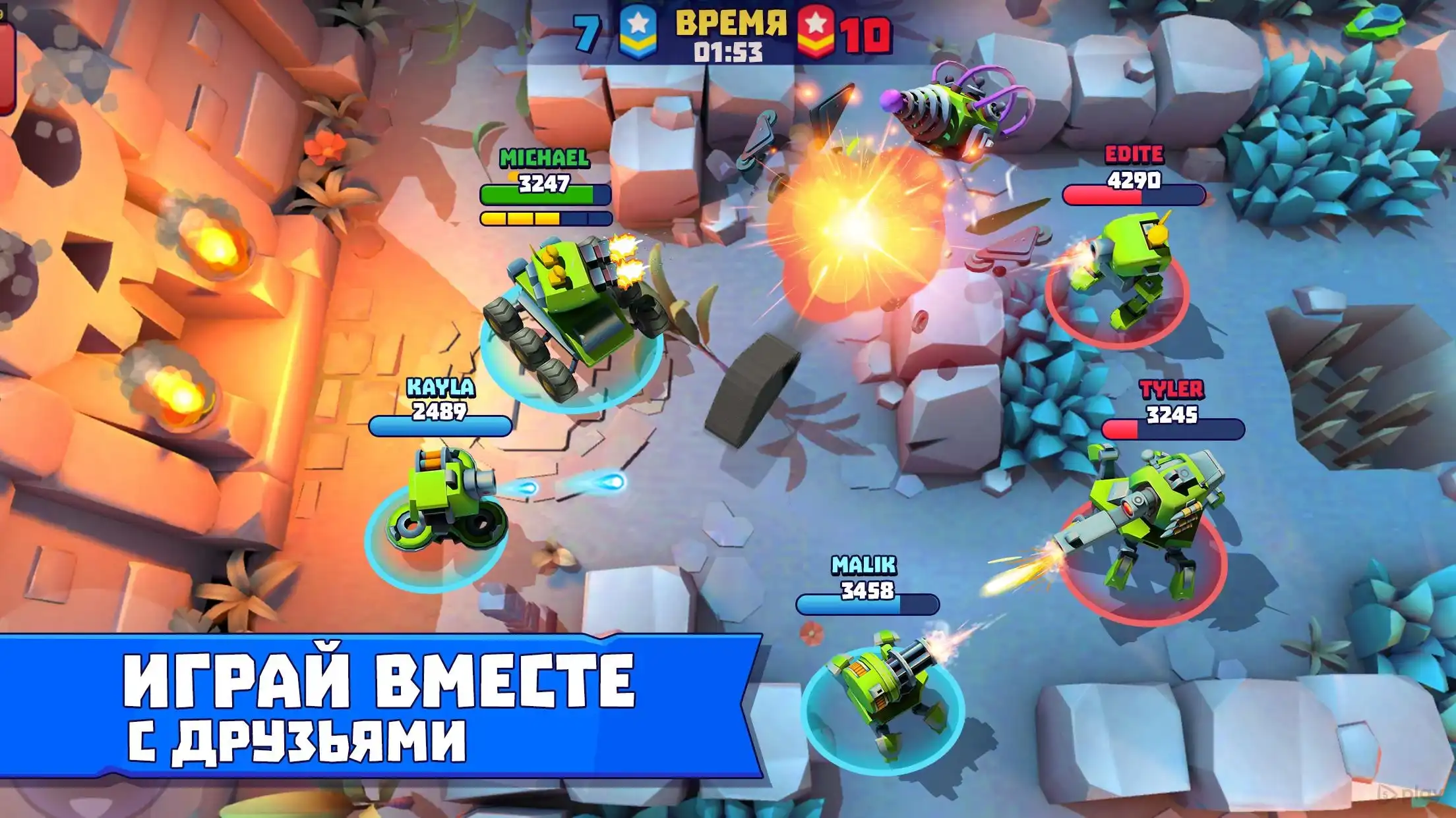 Tanks a lot! — это динамичная стрелялка на Android, где управляешь боевым танком и сражаешься против других игроков или ботов. Геймплей построен на быстрых перестрелках, использовании укрытий и разрушении всего, что мешает проехать. Танки тут фантастические, с разными орудиями и броней, которые можно менять и улучшать.