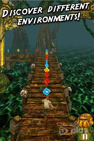 Temple Run — это тот самый раннер, с которого все началось на Android еще в 2011-м. Искатель приключений разбудил злобных обезьян в древнем храме и теперь несется по коридорам, пытаясь не свалиться в пропасть и не врезаться в стену. Управление простое: свайпы влево-вправо для поворотов, вверх для прыжка, вниз для подката. Наклоны телефона помогают уворачиваться от препятствий по бокам.