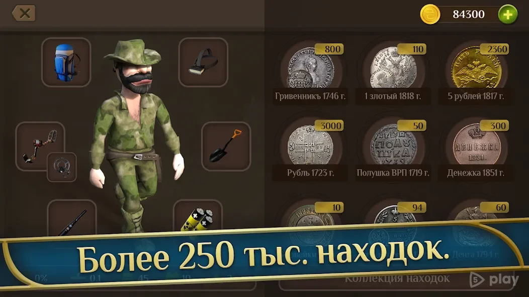Геймплей строится вокруг исследования большой карты. Берешь металлоискатель, находишь точку, копаешь лопатой — достаешь монеты или артефакты. Чем лучше оборудование, тем глубже можешь копать и тем дороже находки.