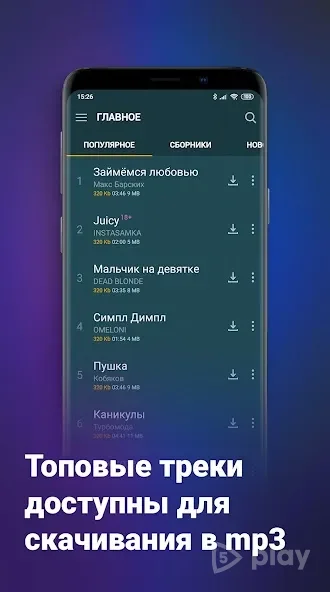 Приложение связано с одноименным музыкальным сайтом. Внутри — миллионы композиций разных жанров и годов. Можно искать по исполнителю, альбому или названию трека. Есть готовые подборки: топы недели, новинки, популярное в жанрах.